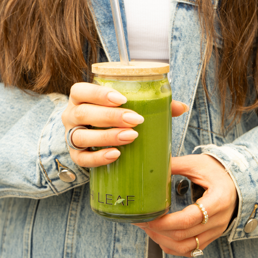Leigh Leaf 16oz Matcha Glass Sipper - Elegant Tempered Glass with Bamboo Lid and Straw