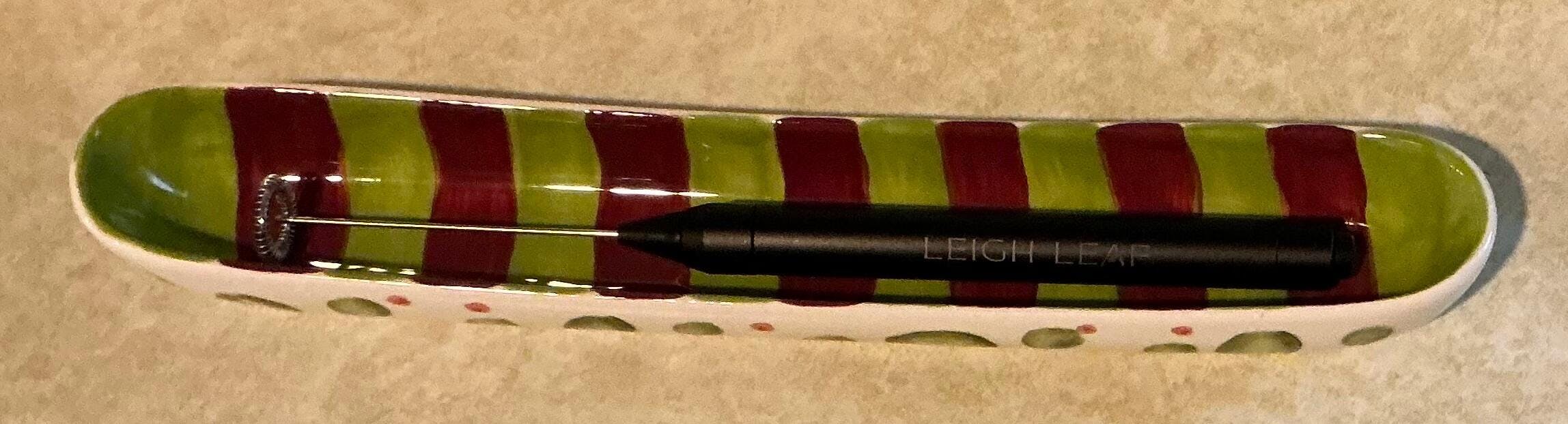 Leigh Leaf’s electric frother is fantastic. It works better than any other frother I have used. It is easy to insert the batteries, and the metal frother end comes off easily for cleaning. I love it! 💕.To protect my new frother, I chose to store it in an olive boat.